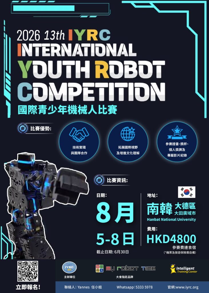 International Youth Robot Competition (IYRC) 是一項全球規模的青少年機械人比賽,2026年賽事將於韓國舉行,吸引來自40多個國家的學生參與。比賽適合8歲以上對機械人有興趣的青少年參加,無論是否有機械人經驗均可報名。