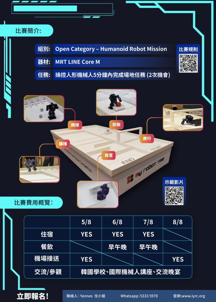 參賽者需組裝及編程機械人,完成避障、任務挑戰等,提升創意、機械設計及自主決策能力。IYRC除了競賽,還設有科學實驗、社交活動及觀光行程,是學生與全球同齡人交流、拓展視野的國際平台。